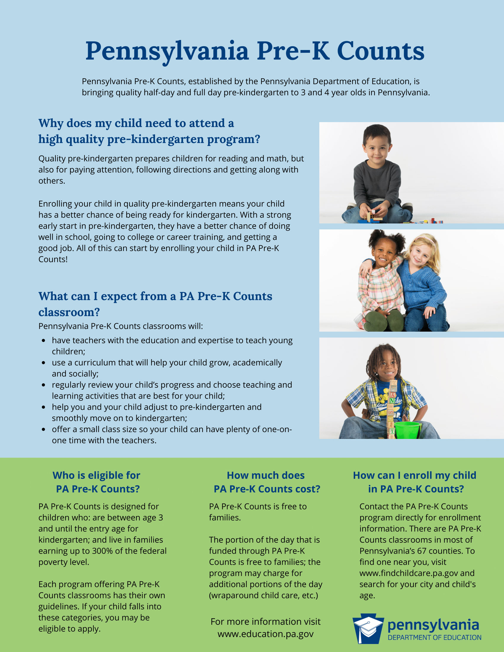 The Pennsylvania Pre-K Counts pre-kindergarten program, established by the Pennsylvania Department of Education, will make quality pre-kindergarten opportunities available to children and families across the commonwealth